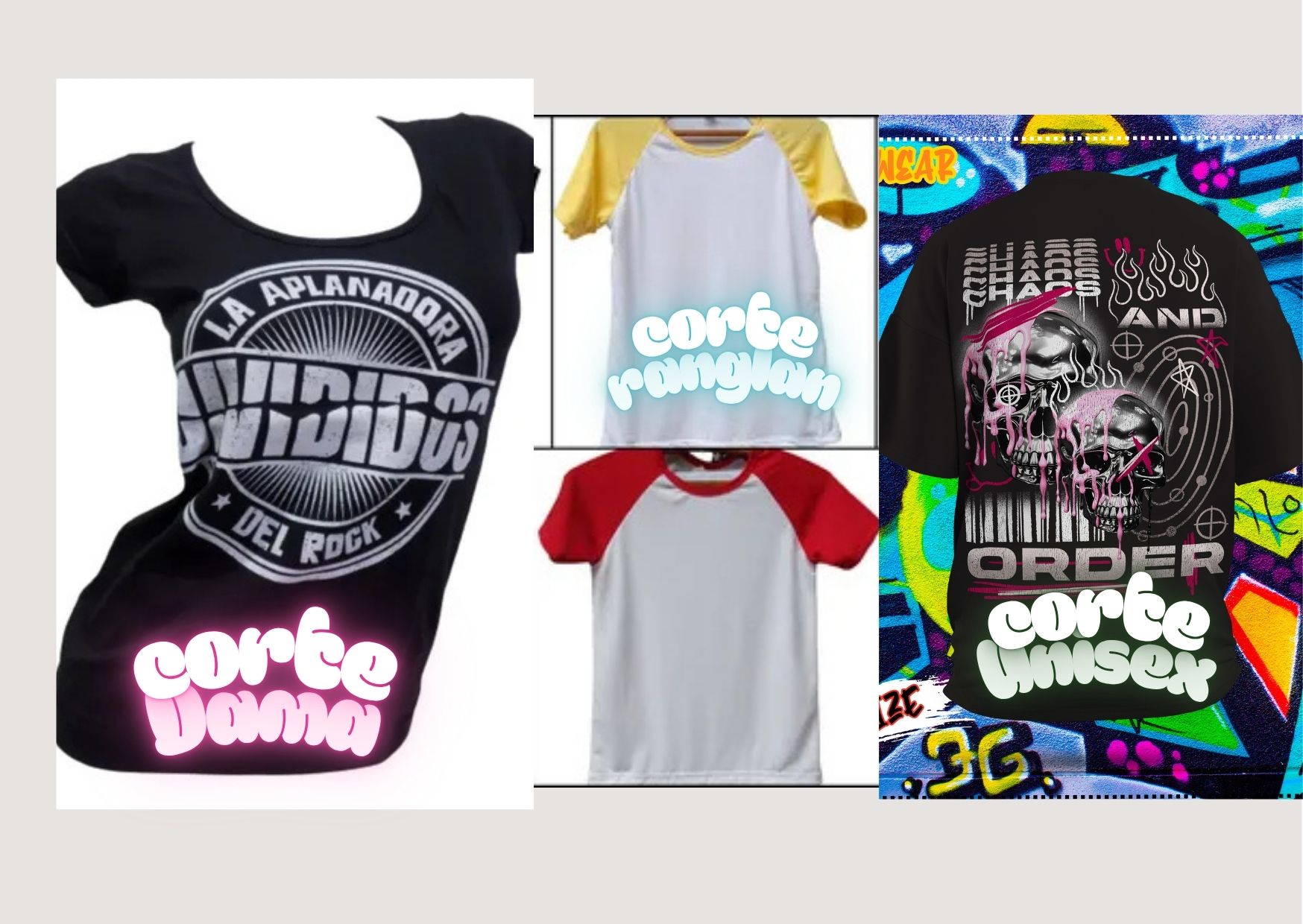 ·        Para adulto corte recto, para damas: mas entalladas, Ranglan con mangas y cuello en colores.